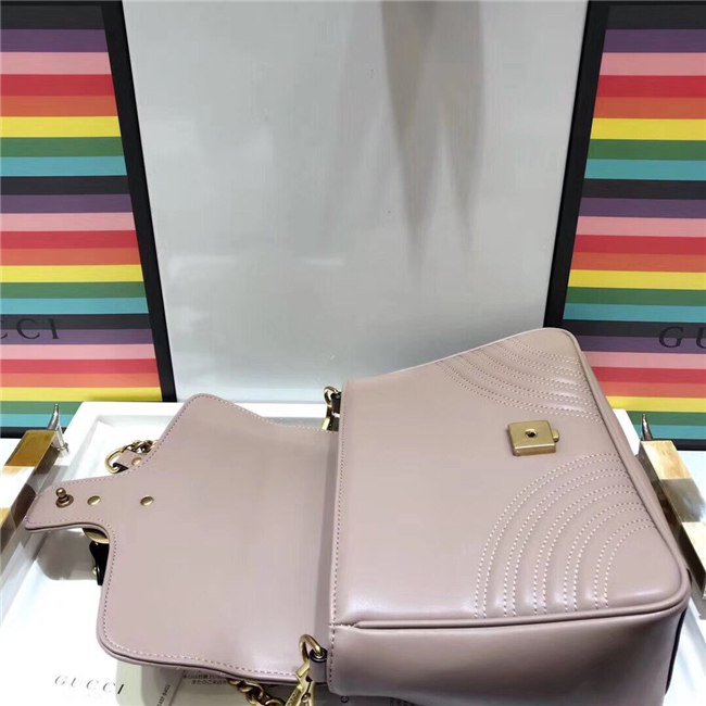 The small GG Marmont top handle bag has a softly structured shape and an oversized flap closure with Double G hardware. Made in matelasse chevron leather with a heart on the back.