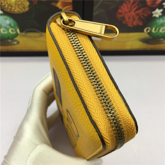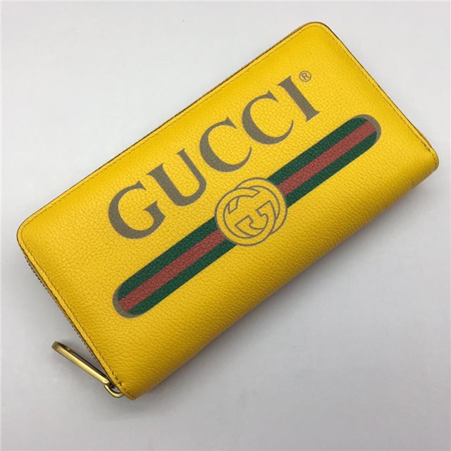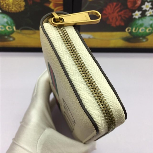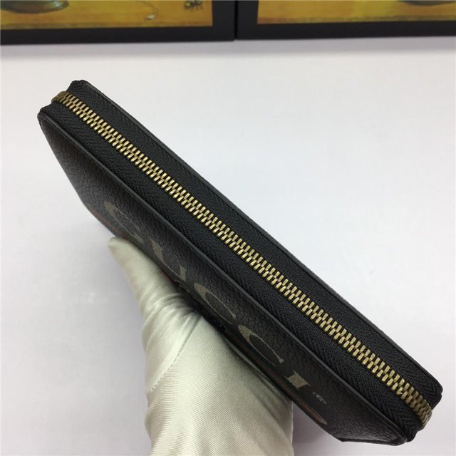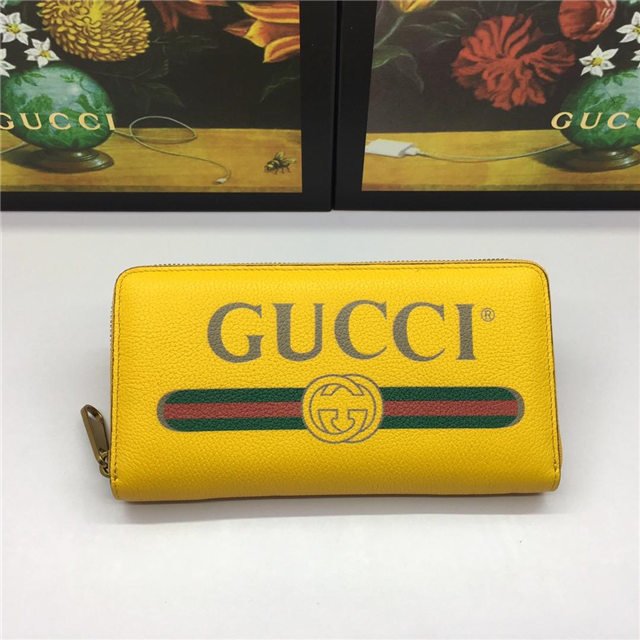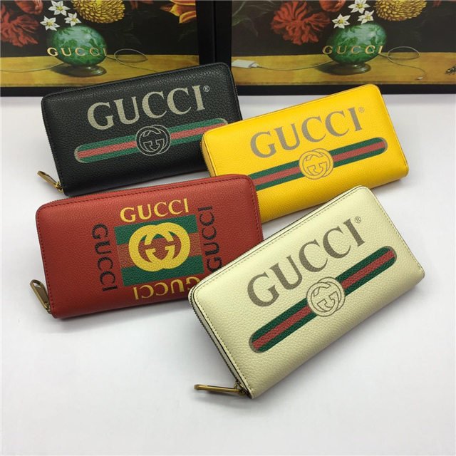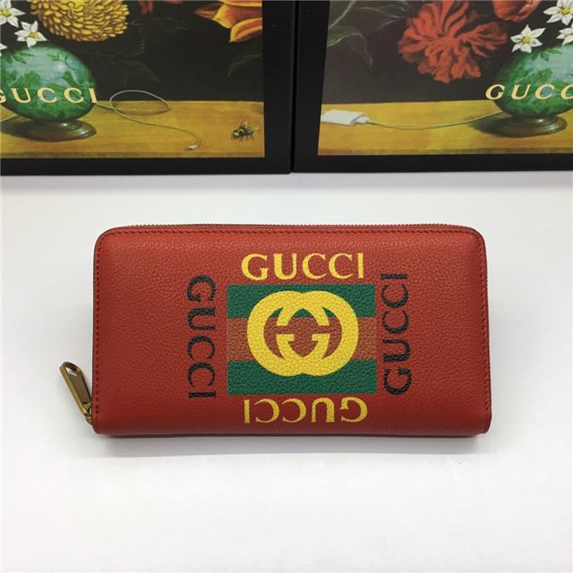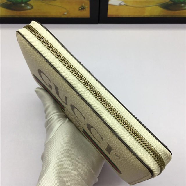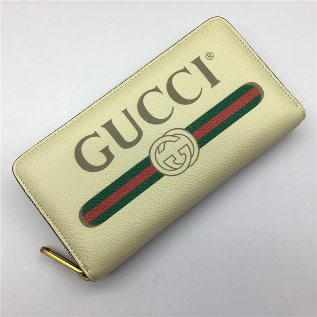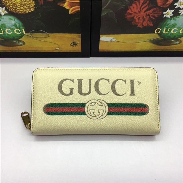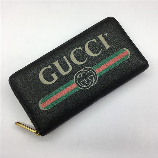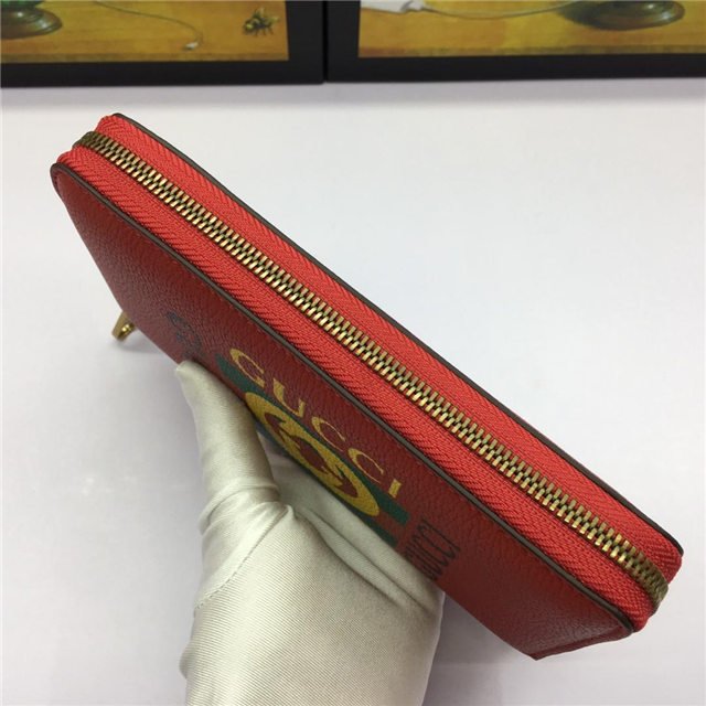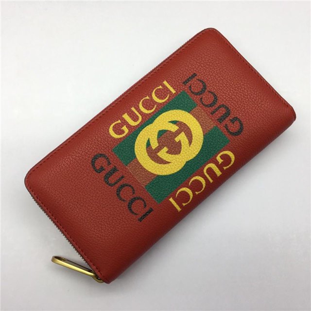Inspired by vintage prints from the eighties, the Gucci logo is brought to the forefront. The retro-style motif is presented on the front of a zip around wallet in supple, textured leather.