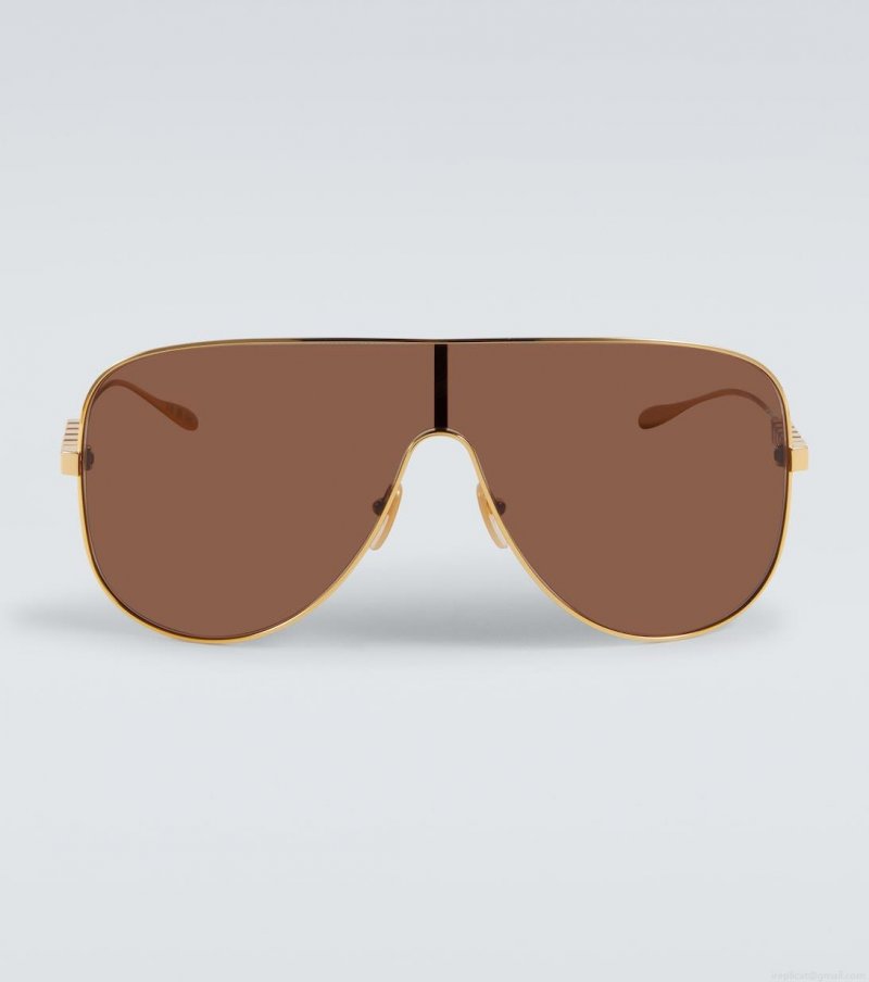 Gucci's mask sunglasses fuse sport detailing with high-octane glamour. The pair boast sleek golden frames, accented with cubic logo-lettered detailing on the temples for a refined finish.