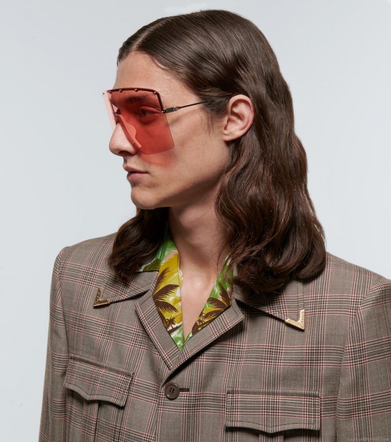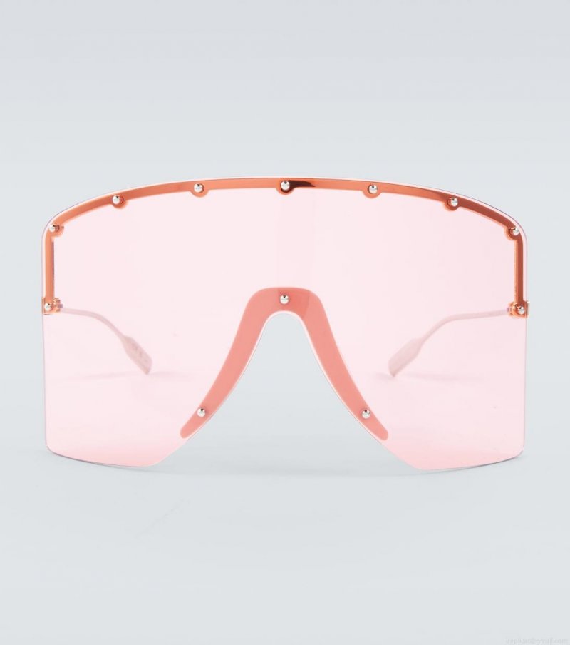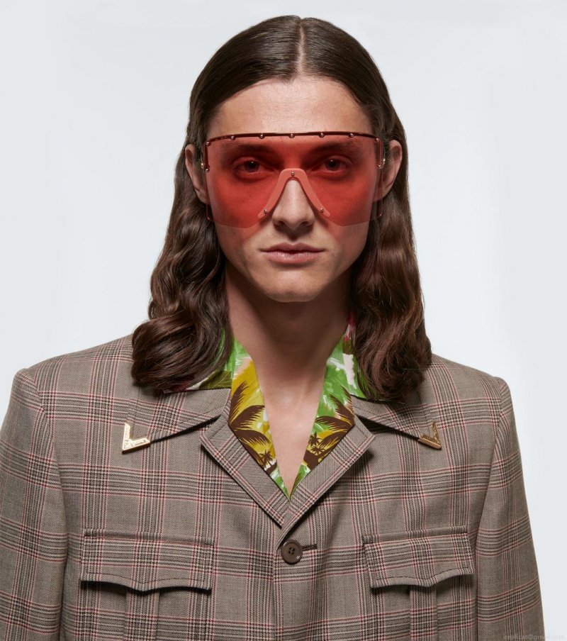 Gucci's mask sunglasses fuse sport detailing with studded glamour. Sleek frames are accented with uniform studs in the metal-on-metal design, and complete with Interlocking G detailing on the temples.