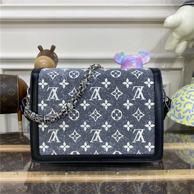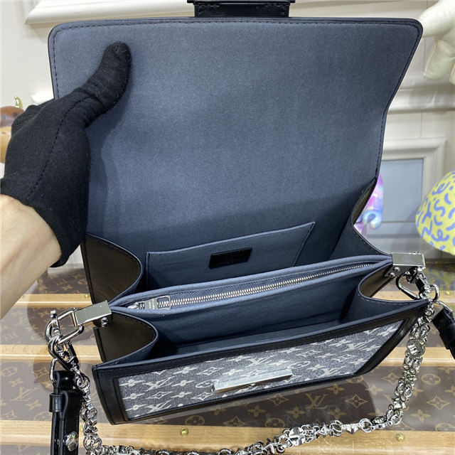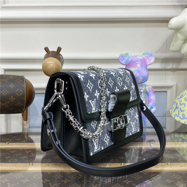 The Dauphine MM handbag is edited this season in gray Monogram Jacquard Denim, a highlight of the Cruise 2023 runway. Black leather trim and an exclusive gothic chain create a sophisticated contrast with the jacquard’s intentionally raw aspect. Fitted with a strap and a chain handle – both removable – the bag is as versatile as it is on-trend.