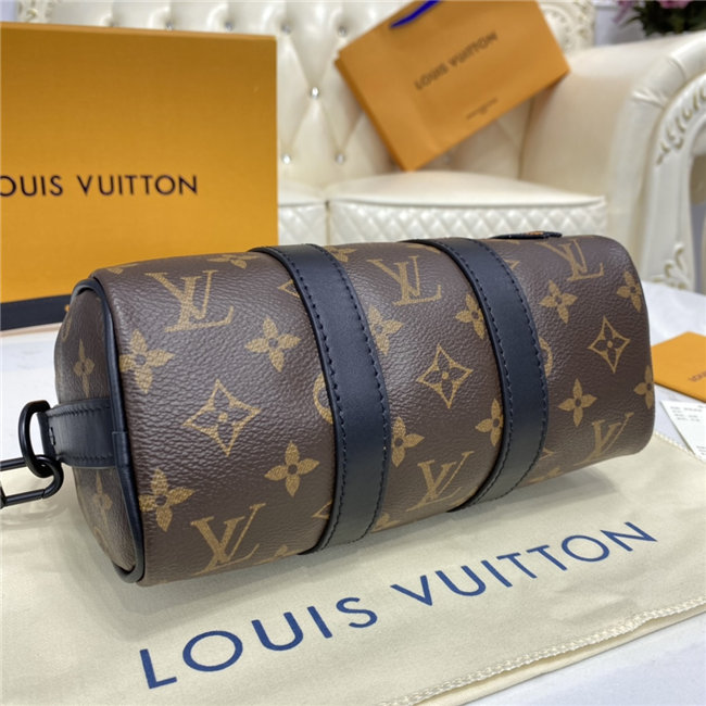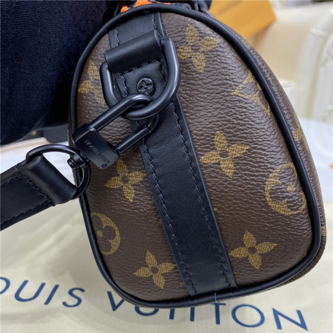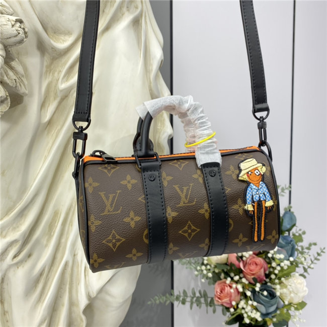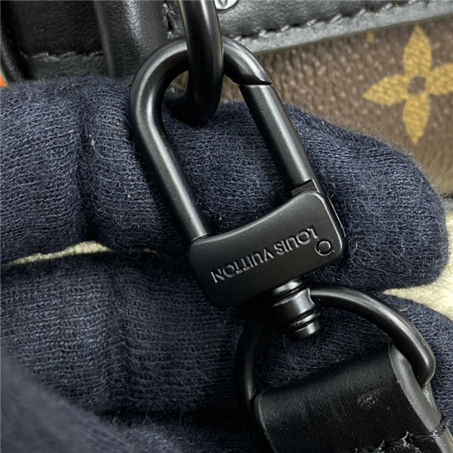 A compact version of the House’s original soft travel bag from 1930, the Keepall XS bag for men pairs Monogram canvas with black matte leather. The classic Louis Vuitton look is enlivened with a touch of florescent orange along the zipper and an embroidered patch of a cartoon LV friend from Virgil Abloh’s “Zoom with friends” animated film.