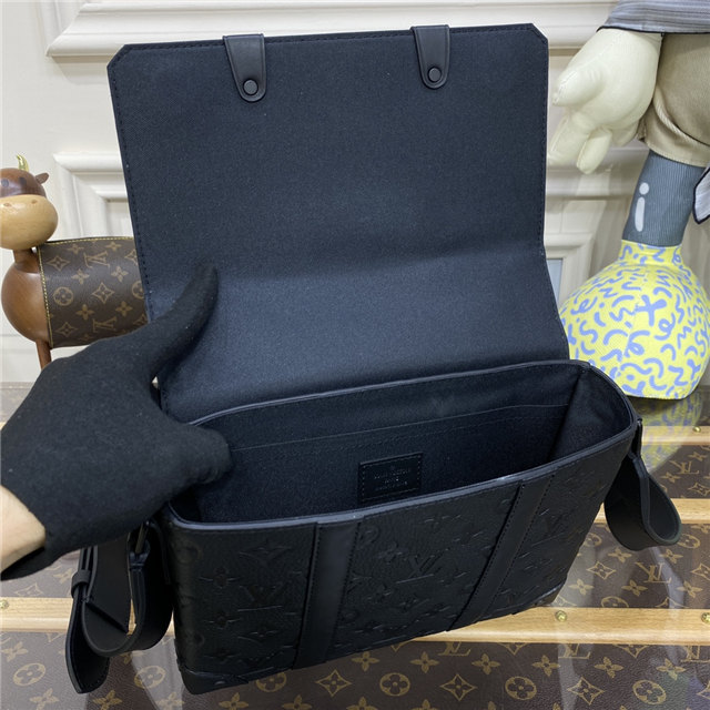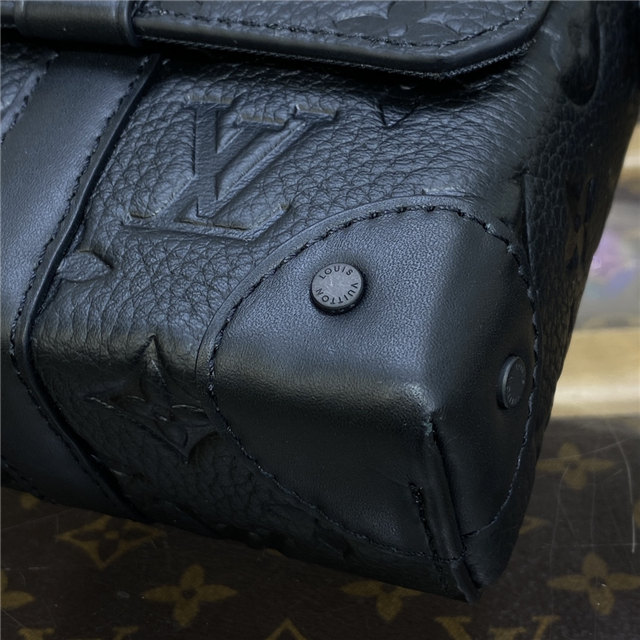 The Trunk Messenger is a small rectangular bag made from Monogram-embossed Taurillon leather and finished with matte-black rivets and reinforced black-leather corners, inspired by those on Louis Vuitton’s iconic trunks. It features an adjustable and removeable strap and numerous pockets, inside and out, to keep things organized and accessible.