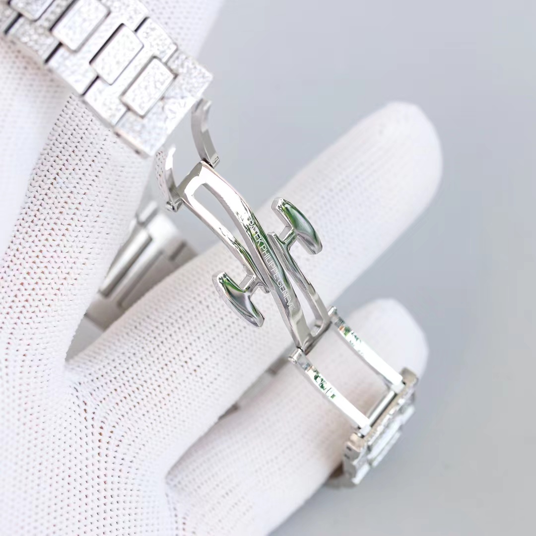 Bracelet: The bracelet showcases a rare “irregular snowflake diamond” craftsmanship with 1,729 diamonds, adding a dazzling touch. This technique involves setting diamonds of different sizes and securing them in place, while attempting to conceal any traces of precious metal between each diamond.