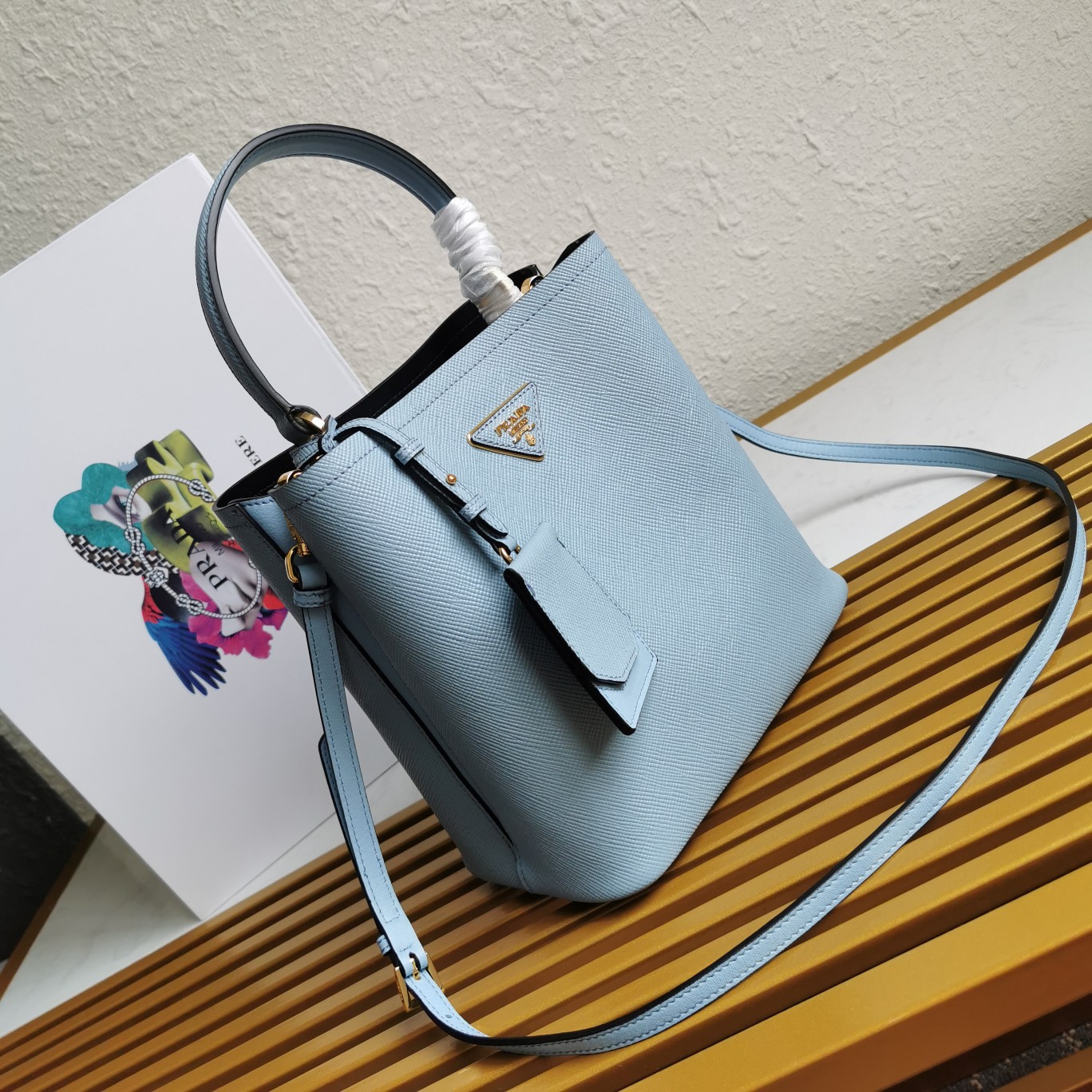 Original item, made with imported Saffiano leather material. The detachable shoulder strap, leather nameplate, and metal logo complement each other. The central pocket with leather-wrapped magnetic closure features a contrasting soft lambskin lining with a Saffiano leather triangle logo. This Double handbag style is elegant, eye-catching, and unique.